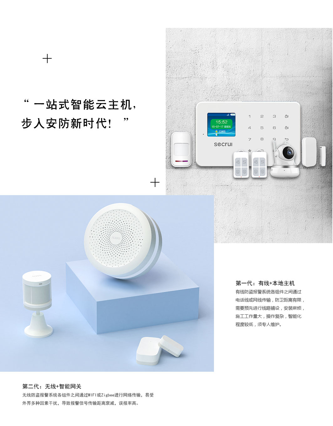 无线防盗报警系统各组件之间通过WIFI(物联网NB-IoT协议)与云主机进行网络传输,前端维护简单、云主机更新方便、本地无需升级。